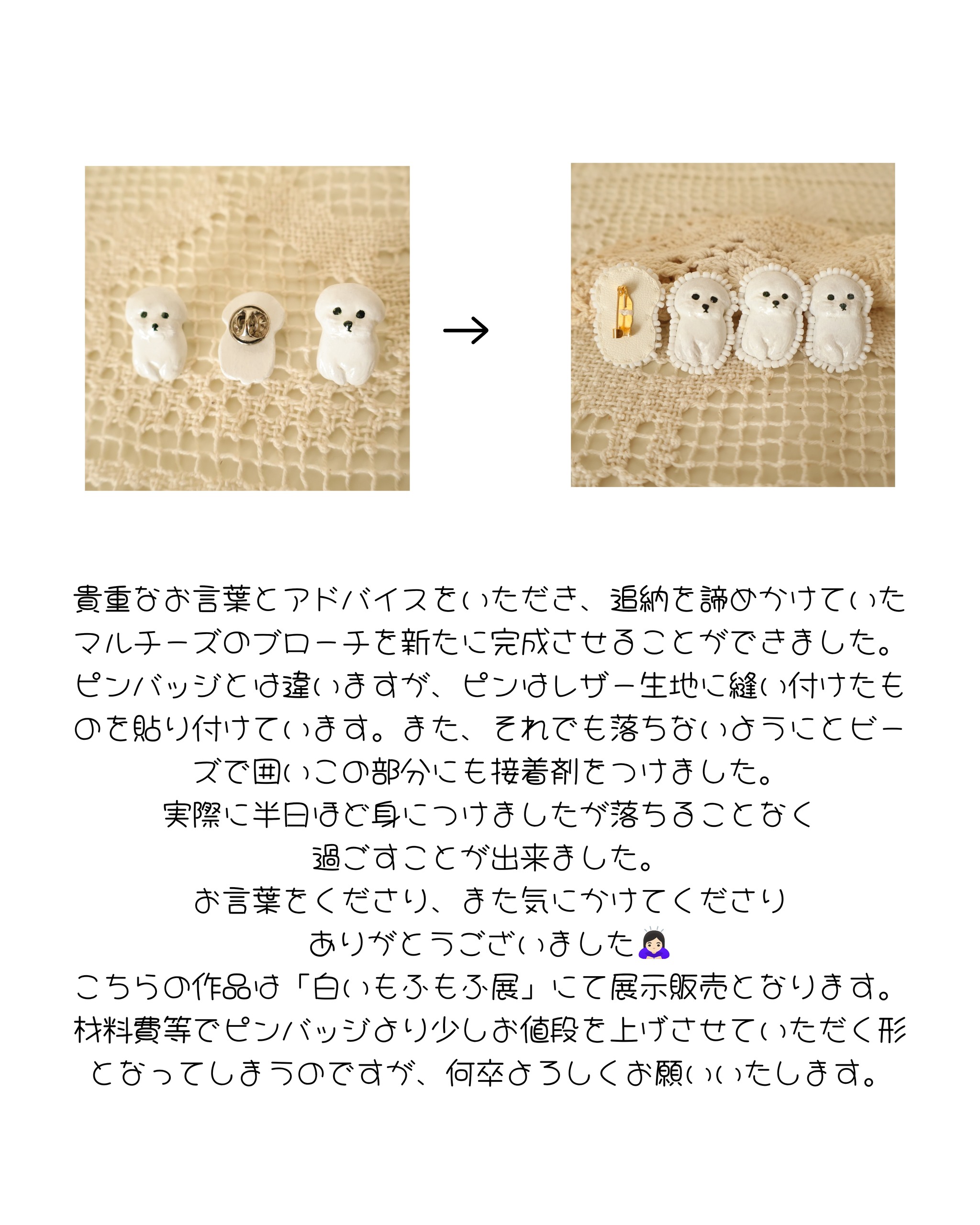 前回、マルチーズのピンバッジを製作し販売をいたしましたが、お迎えされたお客様の中でピンが取れてしまったとのご報告を受けました。その後頑丈なものに変えて完成したのが「マルチーズのブローチ」となります。