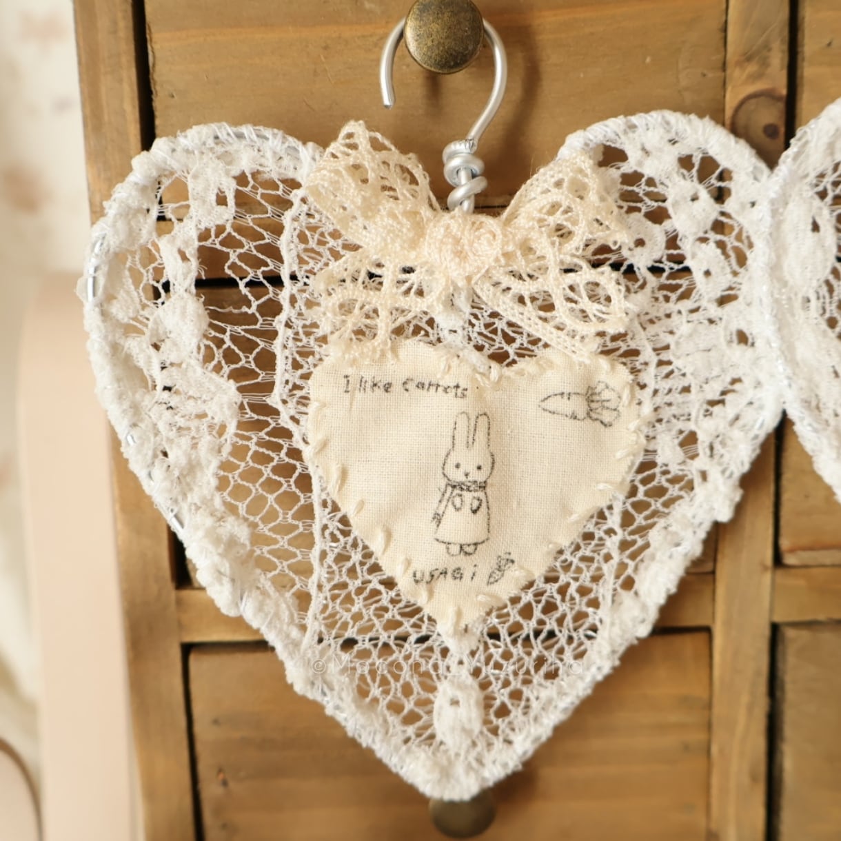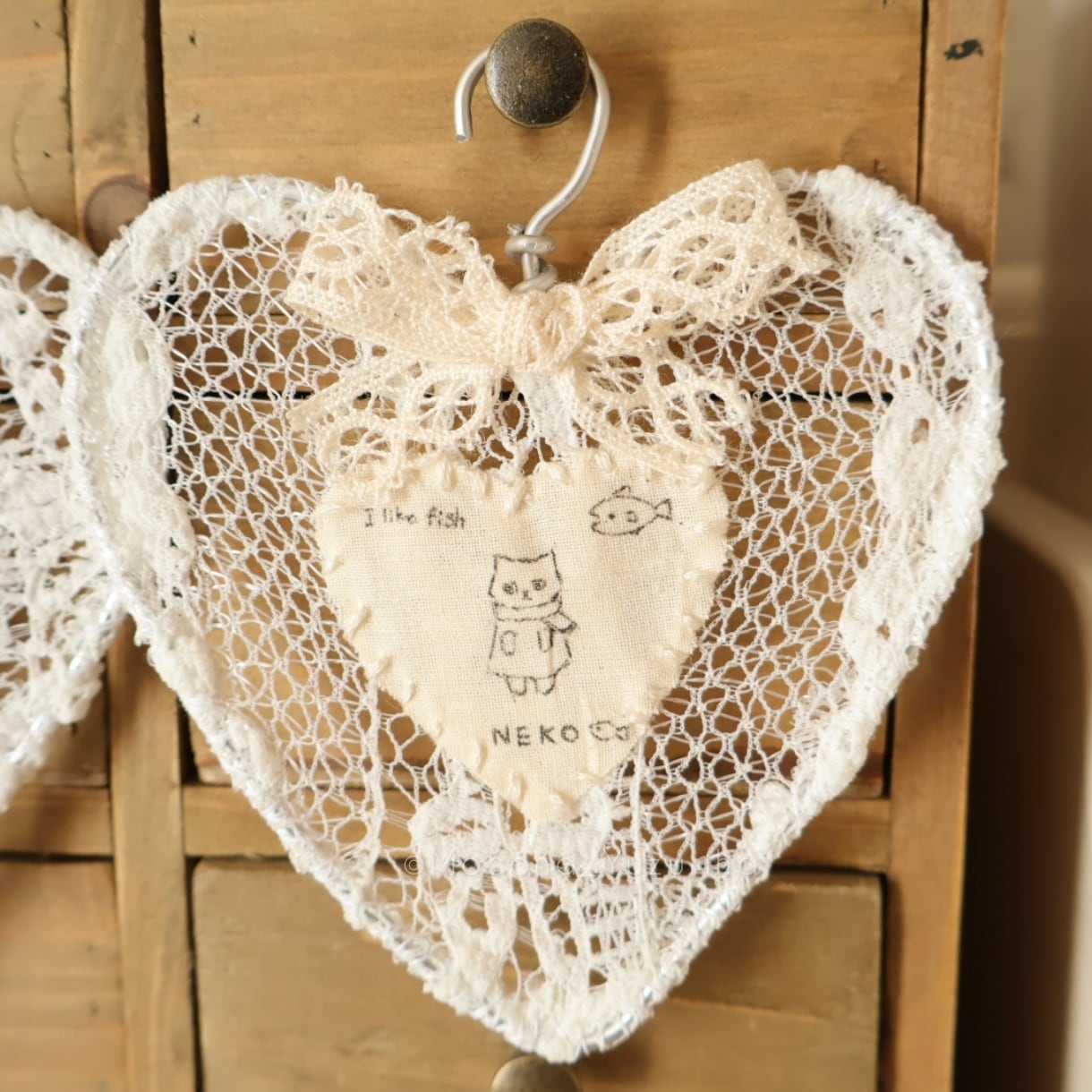 ハート型のワイヤーにレースを取り付け、布には絵を描きました。
